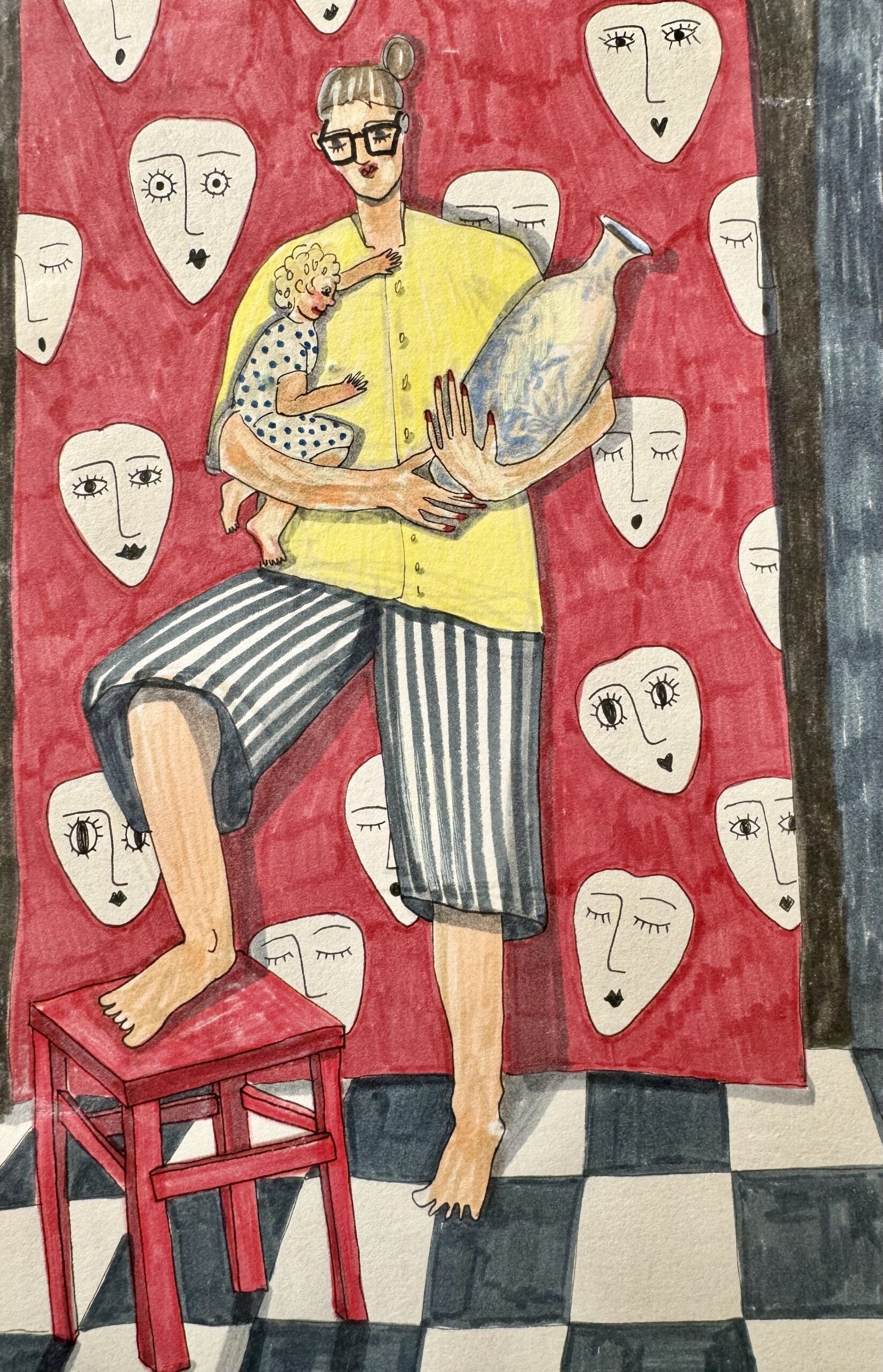 באיוריה יבגניה מתעדת את עצמה ואת בנה בסטודיו או בבית, בתוך מערכת יחסים משולשת ומתוחה בין אם, ילד ואגרטל. האם הקרמיקאית מערסלת ביד אחת את האגרטל בגאווה, וביד שניה מגינה עליו מפני הילד החותר למגע.