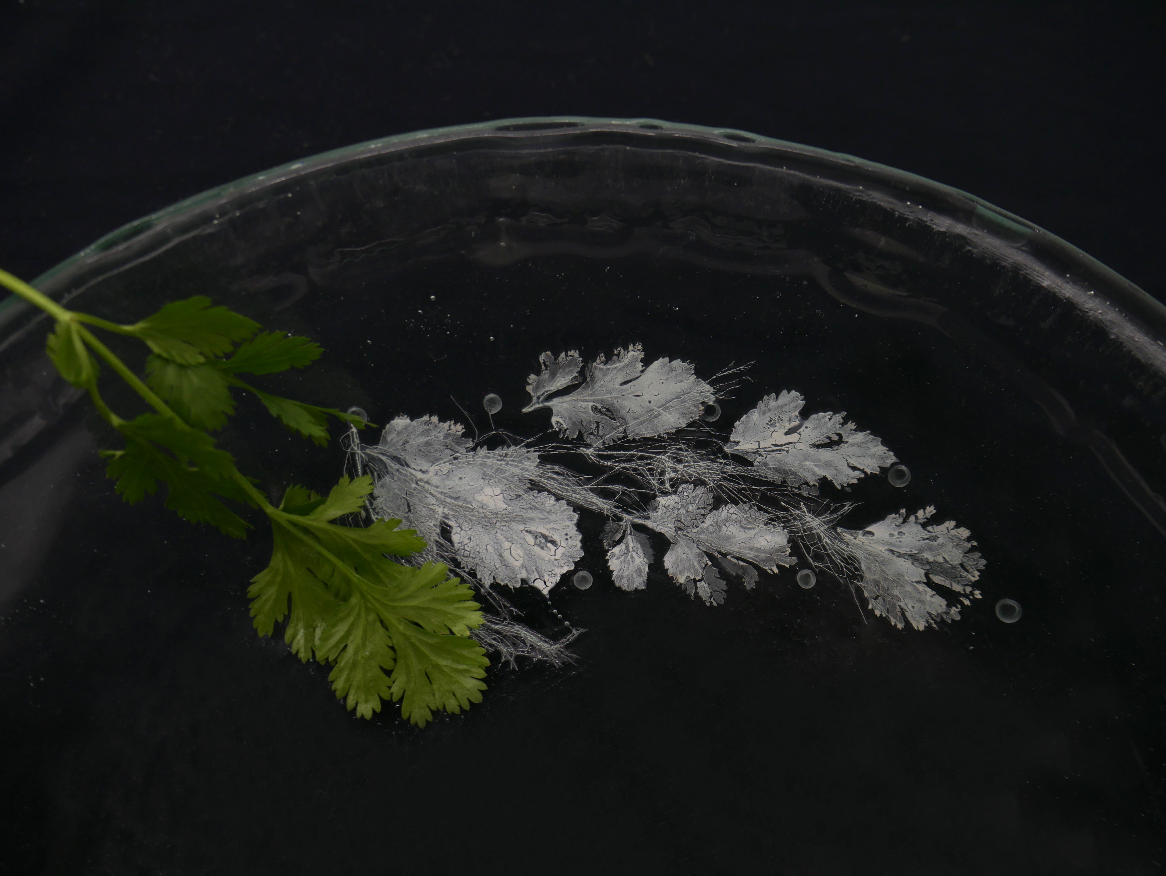 בין הצלחות והקערות המעטרות את קיר הגלריה כלואות שאריות עלי חובזה, עלי גפן, פטרוזיליה, כוסברה, שמיר ועוד ירקות שנקטפו בקפידה בשל צורתם האייקונית והזיכרונות שהם מעוררים בנו דרך בלוטות הטעם.