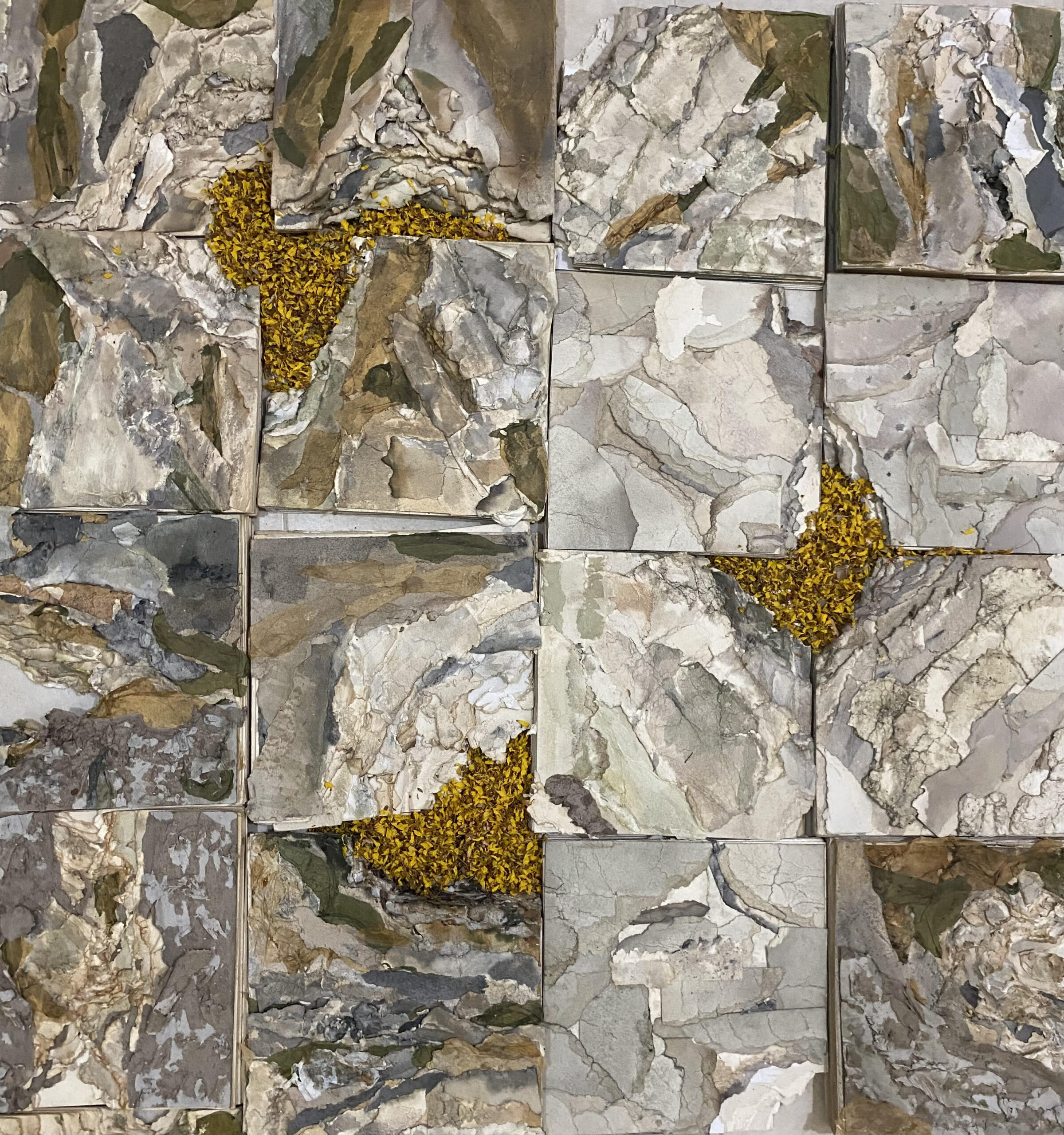 העבודה המרכזית בתערוכה היא מיצב העשוי יחידות קרטון, הנראות בו זמנית כמרצפות בית וכטופוגרפיה של שכבות גיאולוגיות. לצד המיצב, על מדף, מונחים כלים שבריריים העשויים מבוץ גולמי. מוטיב השברים עד התפוררות מופיע גם בפיסות הקרטון המוצמדות לקיר כשרידי אבנים ובבדי הטול בעלי הנוכחות האוורירית כשל רוחות רפאים, שמוטמעת בהם טקסטורה מתעתעת, הנדמית לתחרה רקומה.