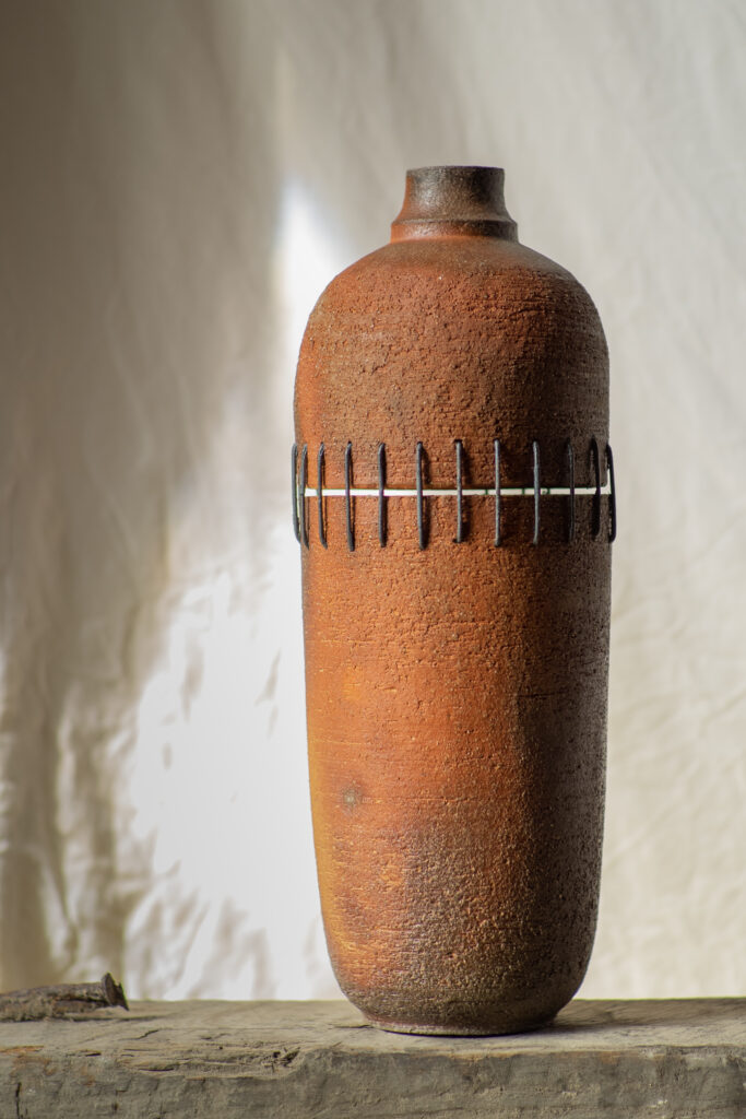 החומר הקרמי משמש כקונסטרוקציה ושכבות החוטים מולבשות עליו בדימויים וצבעים ויחד הם יוצרים יחידה חדשה ושלמה.